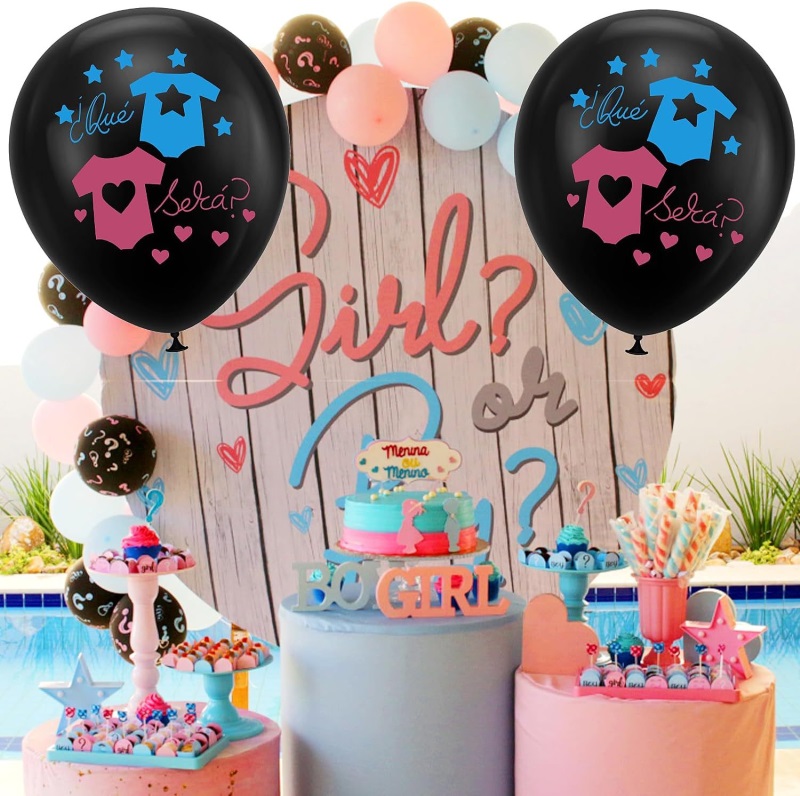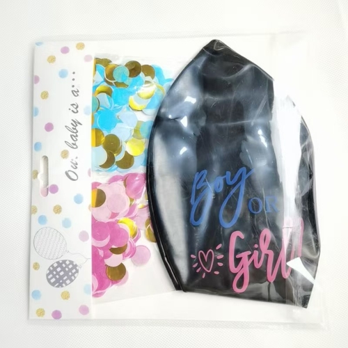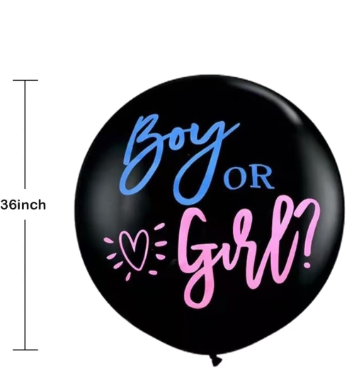 үшін36 дюймдік жынысты көрсететін шарқоймада бұл күңгірт қара түсті және ұл немесе қыз, ұл мен қыз кейіпкерінің суреті немесе ұл мен қызға қатысты басқа нәрсе сияқты басып шығарудың көптеген стильдері бар. Конфетти үшін бір сөмке - фольга алтын түсті конфети бар қызғылт қағаз конфети, екіншісі - фольга алтын түсті конфети бар көк қағаз конфети.
