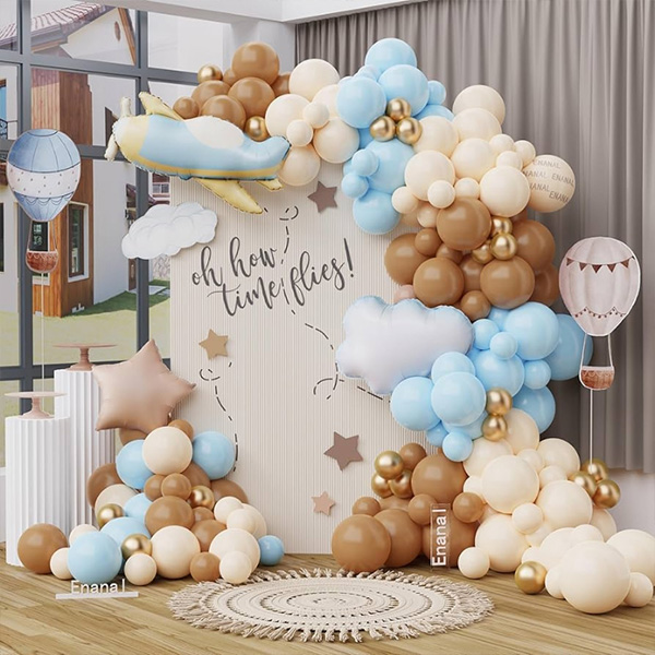 Ұшақ фольгасы шары бар шар гирляндиясы:Бұл ұшақ фольгасы бар шар гирляндтары тұрадылатекс шарлары, фольга шарлары, шар желім дақтар, балық аулау желілері және басқа да шар керек-жарақтары. Бұл аксессуарларды пайдалану оңай шар доғасын жасауға көмектеседі. Біздің латекс шарларымыз және фольга шарларымыз табиғи резеңкеден және жоғары сапалы алюминий фольга материалдарынан жасалған, олар қауіпсіз және улы емес және әдемі шар гирляндтарын жасай алады. Бұл әуе шарының гирляндиясы әртүрлі тақырыптық көріністерге, соның ішінде туған күн кештеріне, ұшақ тақырыптық кештеріне, уақыт ұшатын тақырыптық кештерге және нәрестені шомылдыру рәсіміне арналған кештерге жарайды. Бұл кез келген мерекеге реңк қосу үшін өте қолайлы.