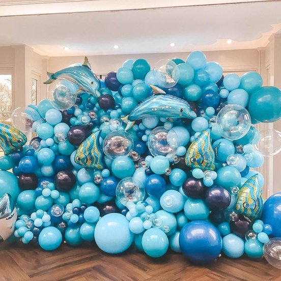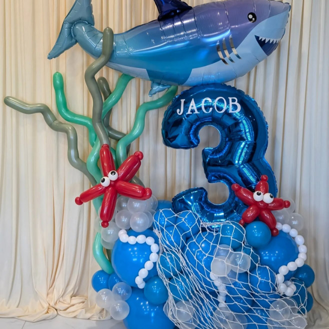 3.Модельдинг шарлары:Шар гирляндында гарлянда акула фольга шарлары бар гирляндтарда, шарлы шарлар әр түрлі пішінді қалыптастыра алады және сегіздік кескінін қалыптастыру үшін латекс шарымен біріктірілуі мүмкін. Сонымен бірге, сіз өзіңіз қалаған теңіз тіршілігінің түрін жасау үшін қиялыңызды қолдана аласыз.