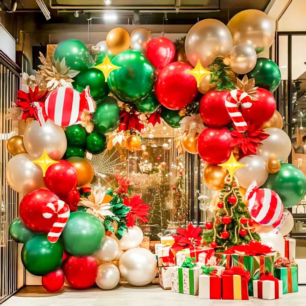 Рождестволық шар аркаларыалуан түрлі. Олар тек латекс шарлары, фольга шарлары, фольга шарлары, шарлар және сиқырлы шарлар, бірақ сонымен қатар фондық маталарды безендірумен бірге қолдануға болады.