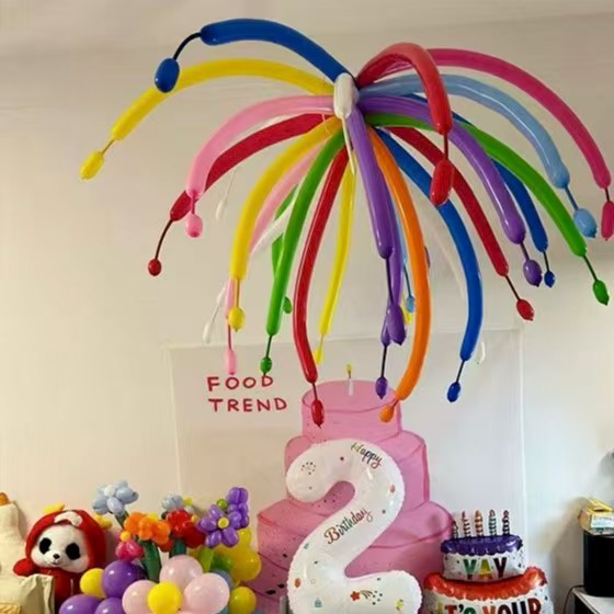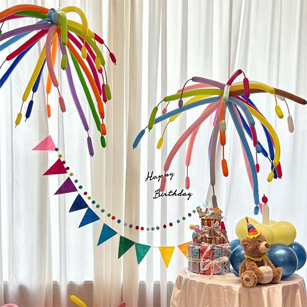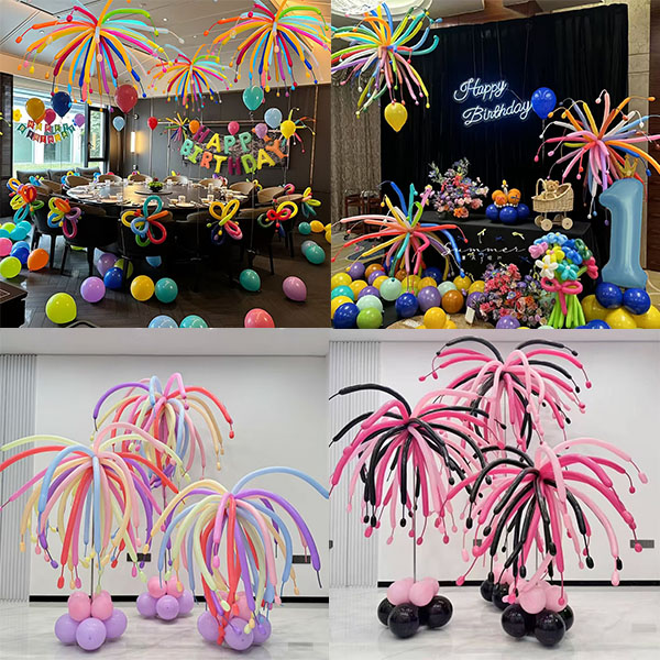 Пішінді дизайн үшін. Шабыт түнгі аспанда жарылып жатқан отшашудан туындайды. Олар жарқын, динамикалық және көзді ұстайды. Ол жарылған кезде отшашу пішінін керемет көшіреді. Ұзын шарлар созылып, орталықтан таралады. Шағын шарлар ұштарында қосылады. Олар отшашуды жоюдың ұшқынына ұқсайды. Өмірлік және жарқын. Оларды кеш төбесіне іліп қойыңыз. Немесе оларды жерге сәндік тіректер ретінде салыңыз. Олар лезде жарылып жатқан отшашулардың әдемі визуалды әсерін жасайды. Партия қонақтары өздерін отшашуларда көрсетеді. Бақытты және жан-жақты атмосферада. Сондай-ақ, төменгі жағындағы шар базасы жақсы жасалған. Әр түрлі түсті жарылған отшашу-пішінді шарлар. Олардың негіздері сәйкес шарлардың комбинацияларын қолданады. База шарды тұрақты ұстайды. Бұл сонымен бірге жалпы сәндік сұлулықты жақсартады. Тұтқаны отшаштағы шарды жоғарыдан төменге біріктіреді. Кеште әдемі көрініс болады.