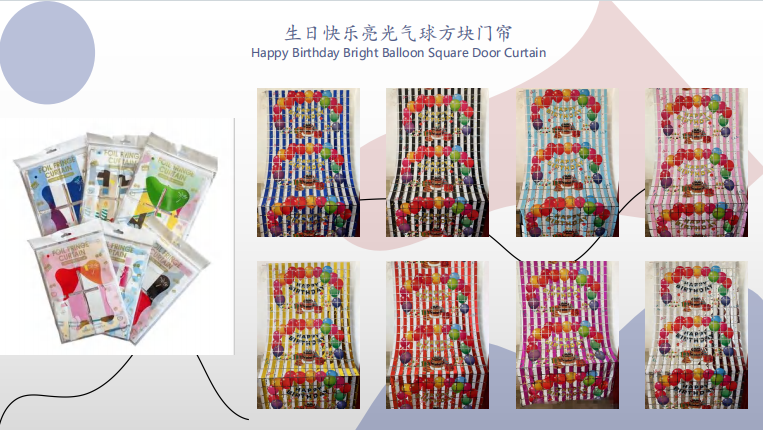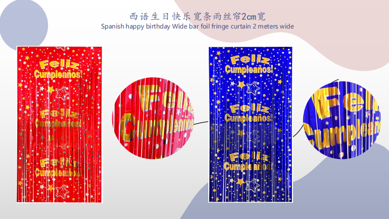 Кемпірқосақтың түстері бар фольга пердесі, макарон түстері және басқа түсті комбинациялар балалар туған күніне арналған кештеріне жарамды. Сондай-ақ, алтын және күміс, мысалы, алтын және күміс, ол ересектер, мерейтойлық мерекелер және т.б. үшін жарқын фольга перделері бар. Оларды партиялық сайттарда, қонақүйге арналған банкет залдарында және т.б. орналастыруға болады.