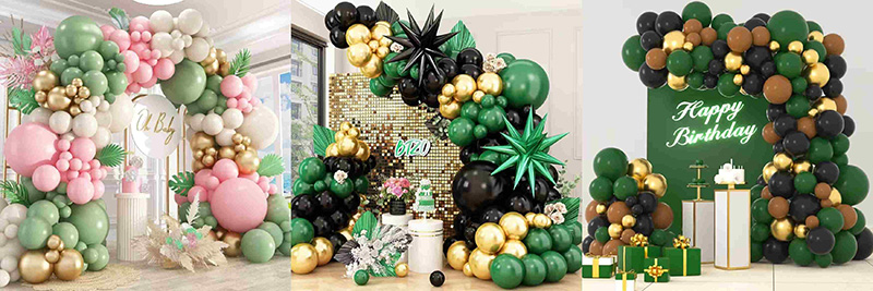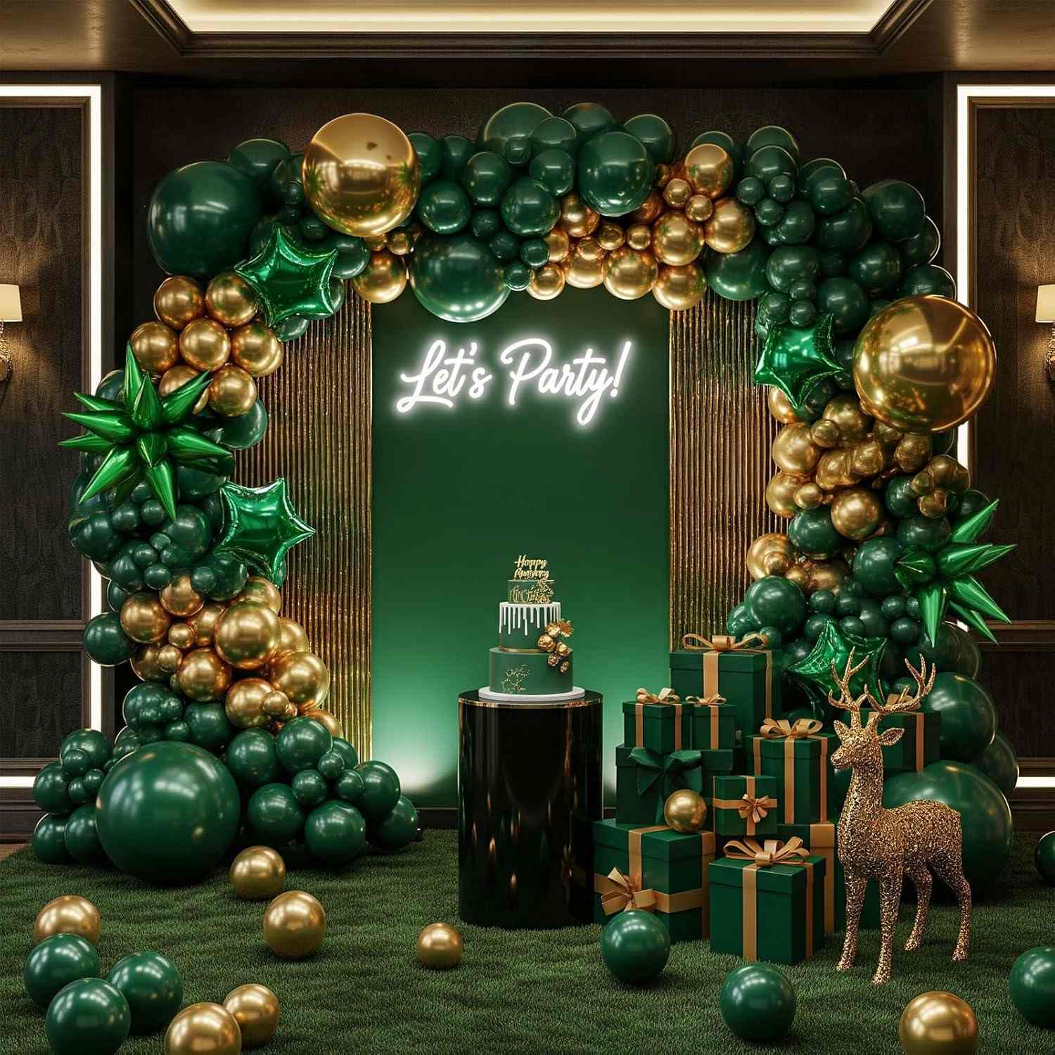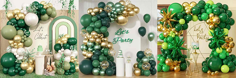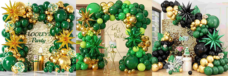 Алтын жұлдыздар фольга шарлары, жасыл жұлдызша фольга шарлары немесе жасыл және алтын шарлар аркасына басқа түсті фольга пішіндерін қосуға болады. Бұл жасыл және алтын тақырыбын сақтайды. Жылтыр фольга оны 3D көбірек етеді және кішкене жарқын бөліктерді қосады. Алтын жұлдыздар шашыраңқы жұлдызды және жасыл жұлдыздарға ұқсайды. Арка тегіс түстерден құрылымдалған, пішінді өнер бөлігіне ауысады. Бұл орау орнының назарын аударады.