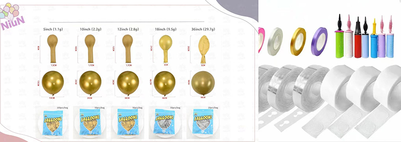 Арка жиынтығында 5 дюйм, 10 дюйм, 12 дюйм, 12 дюйм, 18 дюйм немесе 36 дюймдік шарлар бар. Осы әр түрлі мөлшерді біріктіру сізге толық және қабатталған шарлы шарды оңай жасауға мүмкіндік береді.