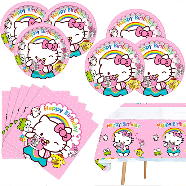 3) ДАМАҚТАМА: Сәлем Китти ыдыс-аяқтарыңыз әлі де сіздің партияңызға сүйкімді атмосфера жасау үшін қызғылт және ақ партиялық жеткізілімдердің ерекше өрнекті дизайнымен жұптастыруға болады. Барлық өнімдер өте берік, ашық түсті және сапалы сезінеді.