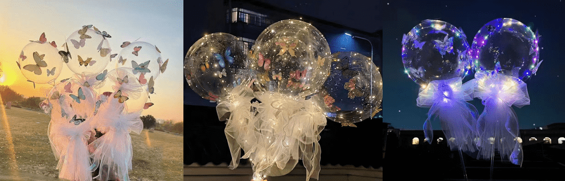 Balloon kits (including ordinary balloons of various sizes, balloon chains and inflators) are important products for decoration such as festivals and celebrations, but a single kit is thick and heavy. Hollow-out butterfly stickers can enrich the layout levels through batch embellishment and local focusing, making large-scale layout more flexible.