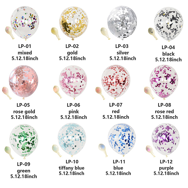 Біздің конфетти шарларының негізгі мөлшері - 5 дюйм, 10 дюйм, 12 дюйм, 18 дюйм, 36 дюйм. Конфетти шарлары латекс шарларына жатады, біреуі екіге бөлінеді, екіншісі - алюминий фольга шарлары. Безендіруді орнатыңыз, шар жиынтығына көп түс қосады, сонымен қатар безендіруді жақсы және әдемі етеді.