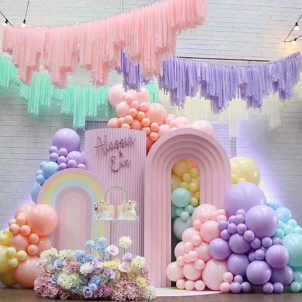 Macaroon шарлары Гарлоондар Гарланд аркы өте күшті визуалды әсер бермейді. Олар әлі де сәнді және тартымды көрінеді. Олар фотосурет фоны ретінде жақсы жұмыс істейді және бренд имиджі мен клиенттердің тәжірибесін жақсартуға көмектеседі.