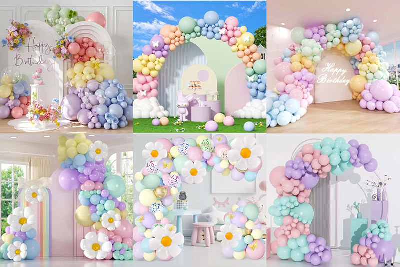 Балалар немесе ересектер үшін, туған күніне арналған макарон шарлары Гарланд аркасы әр түрлі партиялық тербелістер жасай алады. Балалар партиясы жанды және сүйкімді көрінеді. Ересектердің партиясы нақтырақ және классикалық көрінеді.