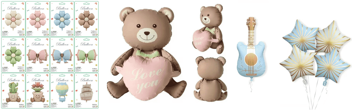 Жұқа аязды текстурасы бар күңгірт фольга шары, төмен қанықтығы жоғары сапалы түсті, жарық бетінің жарнамалық сезімін бұзады, алюминий фольга материалының сапасы да күшті газ ұстағыштығы, үш өлшемді пішіні, практикалық артықшылықтарын бұзу оңай емес, шарлар жиынтығының икемді комбинациясы, латексті шарлар және басқа аксессуар өнімдері бар.