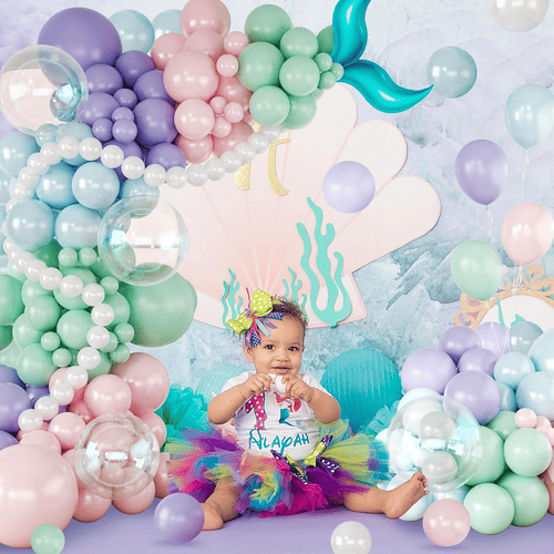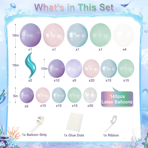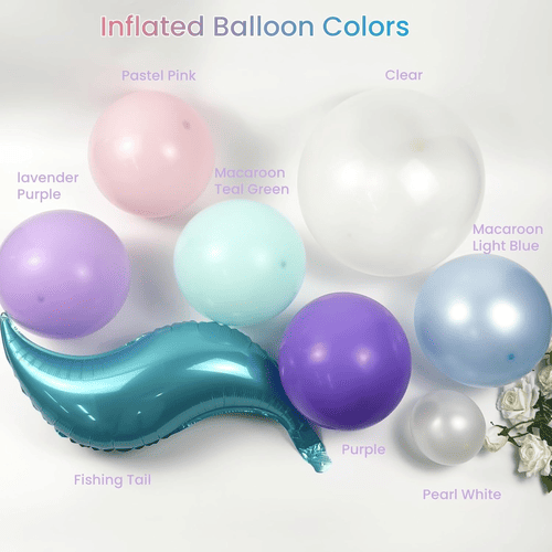 Mermaid шар гирляндиясындағы шарлар күлгін, лаванда, пастель қызғылт, ашық көк, көкшіл жасыл, меруерт ақ және мөлдір, сонымен қатар су перісі құйрығын фольгамен безендірумен бірге сиқырлы су перісін мұхит тақырыбына арналған кешті құруға тамаша етеді.