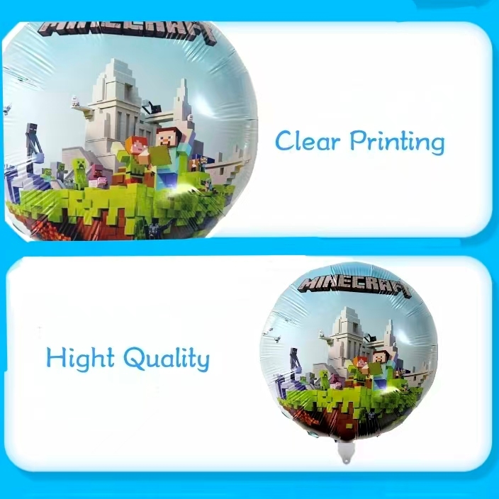 Minecraft Арнайы пішінді фольга шарлары Қиял мен ойын элементтерін араластырады. Олардың көптеген 3D формалары бар. Кейіпкерлерге Стив, Крепер және Эндмер кіреді. Әрқайсысы ойын мәліметтерін көшіреді. Сондай-ақ, гауһар тастар, TNT блоктары және ойын контроллері сияқты заттар бар. Олар партиялық әшекейлерді көңілді және байытады. Әр шар пиксель стилін қолданады. Крэпердің жасыл блок корпусы бар. Стив бар көк көйлек бар. Мәліметтер Блок әлемін нақты партияда сезінеді.