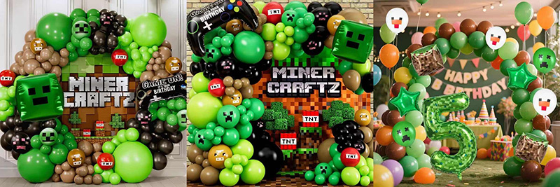 Малкрафт фольга шарлары Шарларға кішкене жиындар оңай кештер немесе кішігірім жиындар үшін жасалады. Олар фольга шарларының әртүрлі стильдерін араластырады немесе оларды жиындар жасау үшін латекс шарларының аз санымен жұптастырыңыз. «Таңба + элемент» жиынтығы Стив шарлары, гауһар тастар және дөңгелек шарлар бар. «Сандық + көрініс» жиынтығыде сандық шарлар мен шөптер блоктарының шарлары бар. Жиынтықтағы шарлар бір-біріне сәйкес келеді. Сіз тезірек тақырыпты қосымша күш жұмсай аласыз.