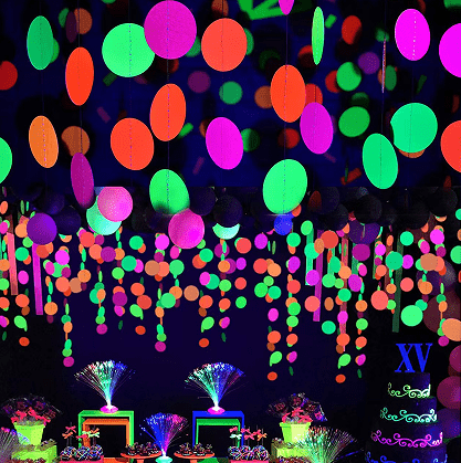 Неон шарының аркасы күлгін/қара жарық астында күшті неон жарқылын көрсетеді.