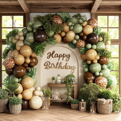 Safari шары аркасында орман тақырыбының негізгі элементтері бар. Қоңыр шарлар ағаш діңін, жасыл шарлар жапырақтарды бейнелейді, ал әр түрлі басып шығарылған шарлар әртүрлі жануарларды бейнелейді, бұл орманда кеш өткізу сезімін тудырады. Ол еш қиындықсыз стильді және атмосфералық кеш сахнасын жасайды.