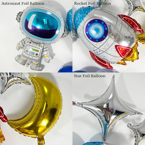 Фольга шарларында астронавтар, зымырандар, ұшатын тәрелкелер және басқа стильдер бар, олар осы гирляндияға үлкен қызығушылық пен шындықты қосады.