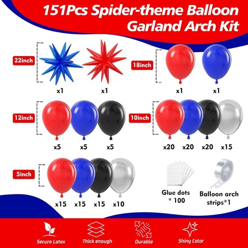 Шарлар жиынтығының негізгі түстері - көк, қызыл және қара. Ерекше үш түс сізді фильмдегі Өрмекші-адамның керемет бейнесін елестетуге мәжбүр етеді. Бұл жиынтықтағы латексті шарлар күңгірт қызыл шар, күңгірт көк шар, күңгірт қара шар, металл жіптен жасалған шарды қамтиды. Бұл жиынтықтағы фольга шары - жарылыс жұлдызды фольга шары, түсі көк және қызыл.