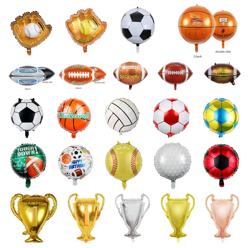 Дизайн спорттық жабдықтарды модельдеу, баскетбол, футбол, гантельдер, гантельдер, спорттық көрсеткіштер, спорт қайраткерлері, «жеңіс», «гол» және «чемпион» және басқа да ынталандыру хаттары. Бір үлкен мөлшерде (18-36 дюйм) шарға күрделі сәйкестік қажет емес және орталыққа немесе қызметтің кіруіне ілінген кезде көрнекі фокус бола алады. Бұл әсіресе кең ауқымды іс-шараларды, ашық спорттық іс-шараларды және кампустың спорттық ойындарын қуанту, сахнаның ынта-жігерін бірден елемеу сияқты көріністер үшін жарамды.