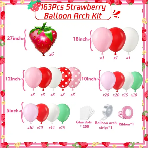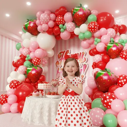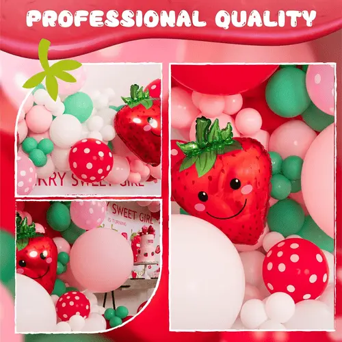 Құлпынай тақырыбына арналған шар гирляндиясы жоғары сапалы латекс шарынан және фольга шарынан тұрады. Жиынтықтағы ең көрнекті элемент - 27 дюймдік құлпынай фольга шары. Бұған қоса, ондағы латекс шарлары да маңызды бөлік болып табылады. Жинақтағы латекс шарлары әртүрлі түстер мен өлшемдерге ие, олар керемет қабаттар жасай алады. Латекс шарының түсі макаррон қызғылт, күңгірт қызыл, күңгірт қою қызғылт, ретро піл сүйегі ақ.