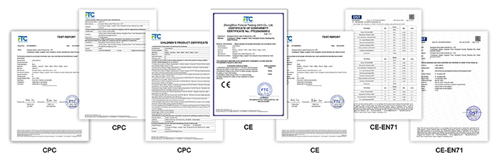 Біздің өнімдердің толық ассортименті еуропалық және американдық және басқа мақсатты нарықтағы қауіпсіздік ережелеріне қатаң сәйкес келетін CPC, CE, EN71 және басқа да беделді сертификаттаудан өтті. Бұл біліктіліктер сіздің тауарларыңызға кеденді кедергісіз өткізуге және шетел нарықтарында сәйкестік тәуекелдерін толығымен болдырмауға көмектеседі.