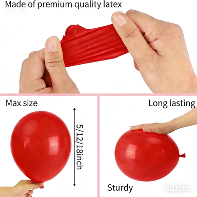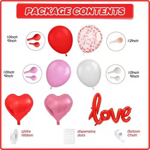 Бұл шарлар жинағы негізінен тұрадылатекс шарларыжәне бірнешефольга шары. Олардың латекс шарлары қызыл, қызғылт, ақ түсті. Олар 100% табиғи латекстен жасалған, ол мүлдем экологиялық таза және адам ағзасына зиянсыз. Және олардың көлемі де әртүрлі. Әдемі қабатты орнату үшін латекс шарларының өлшемдері 5 дюймден 12 дюймге дейін. Оларды жиынтықта орналастыру өте оңай, біз онымен нүктелік желім мен шар тізбегін дайындаймыз. Сондықтан оны реттей отырып, сіз оны икемділікпен жасай аласыз.
